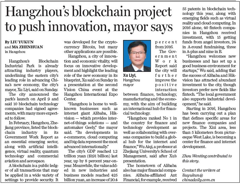 Hangzhou’s Blockchain Industrial Park is already attracting industry players, underlining the eastern city’s leading role in advancing China’s new economy, the city’s mayor, Xu Liyi, said on Sunday.